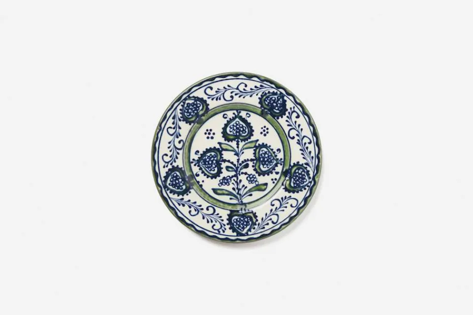 Denna porslinsservis med blå blommor drejas och målas för hand i Rumänien. Den är skapad efter antika, transsylvaniska keramikföremål som bär kulturella influenser från Balkan och Italien i söder, Europa i väster och Osmanska riket och Asien i öster. Keramiken bränns tre gånger i över 1000 grader, vilket gör färgerna skarpa och klara.