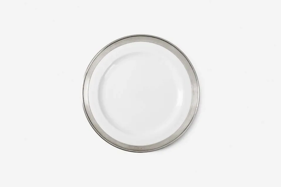 Att forma fat, tallrikar och skålar i tenn och porslin går långt tillbaka i tiden. Redan på 900-talet började tenn användas för att skapa funktionella vardagsföremål och på 1600-talet blev det allt vanligare att använda graverat tenn i finare dukningar. Denna undertallrik i tenn och porslin tillverkas av det lilla, familjeägda företaget Cosi Tabellini som grundades 1954 i den italienska staden Brescia.