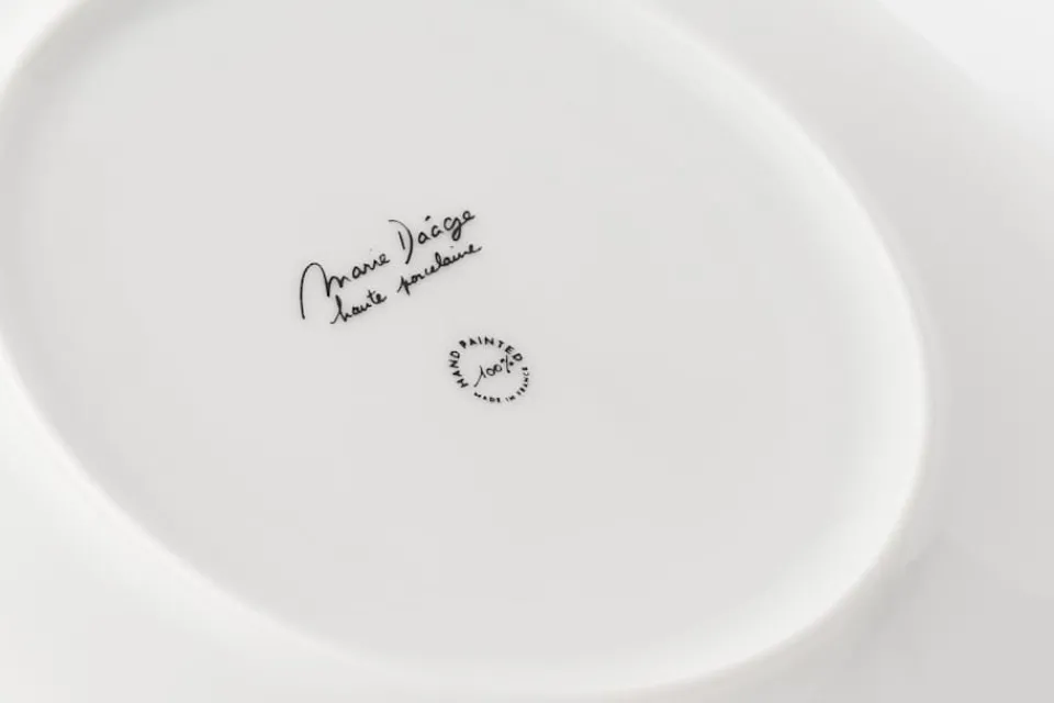 Assiett Paris tillverkas i Frankrike av det anrika porslinsföretaget Marie Daâge. Med stor precision och hantverksskicklighet målas varje del av porslinet för hand, vilket innebär att varje assiett är unik i sitt utförande. Den tunna, handmålade kantlinjen består av 24-karats guld. Denna assiett tillför en estetiskt lekfull och elegant känsla till varje dukning.