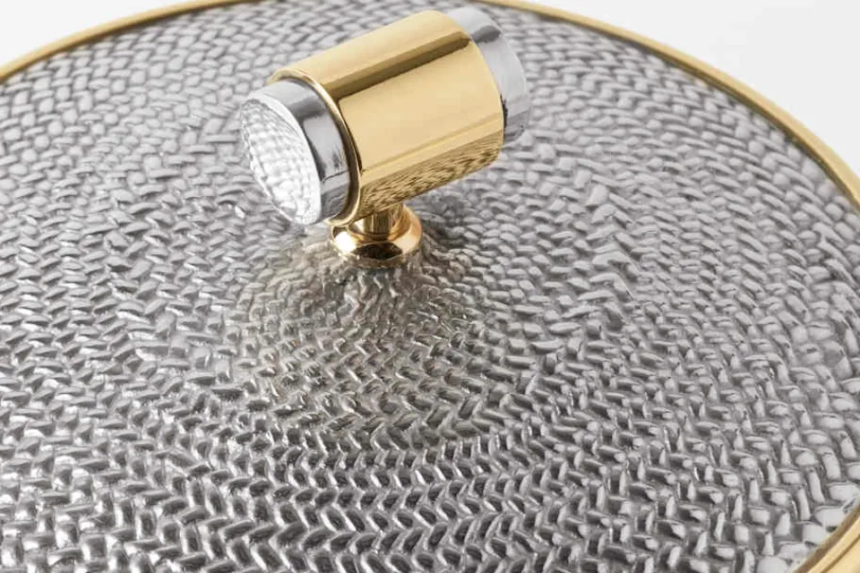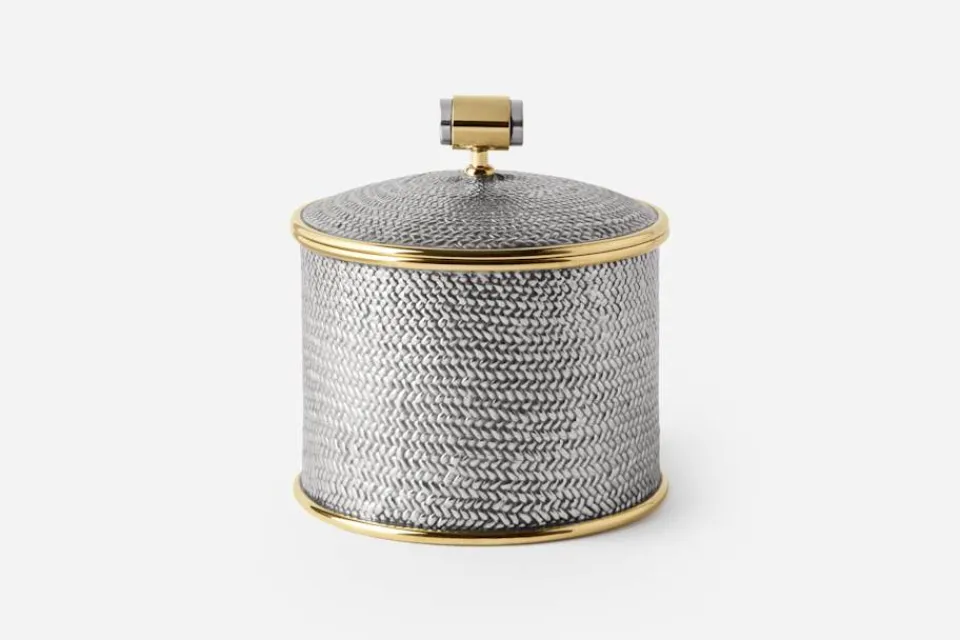 En rund tennburk med knopp i mässing, formgiven av Björn Trägårdh 1935-36. Det så kallade ”Panamamönstret” finns med på ett flertal tennföremål formgivna av Björn Trägårdh under denna period, och det har fått sitt namn efter likheten med den flätade panamahatten.