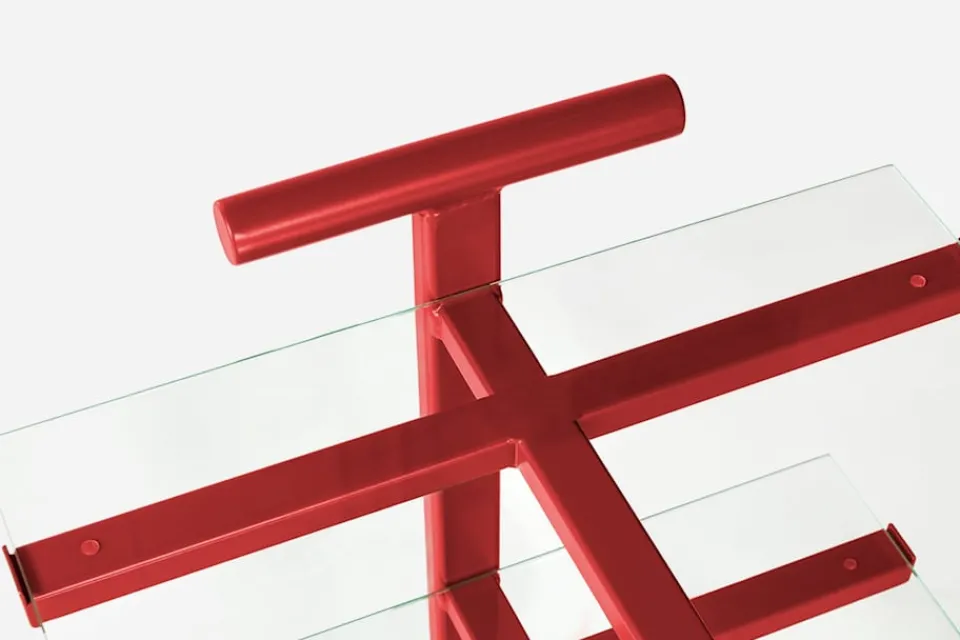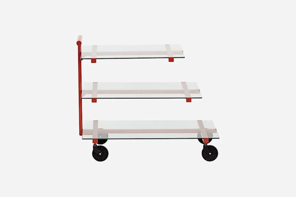 Denna stilsäkra tevagn formgavs ursprungligen av Josef Frank i svart och valnöt, under 1930-talets andra hälft. Den här versionen tillkom på 1980-talet då den lackades i olika kulörer och fick sina hyllplan utbytta mot glasskivor.