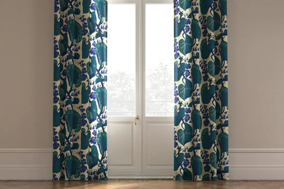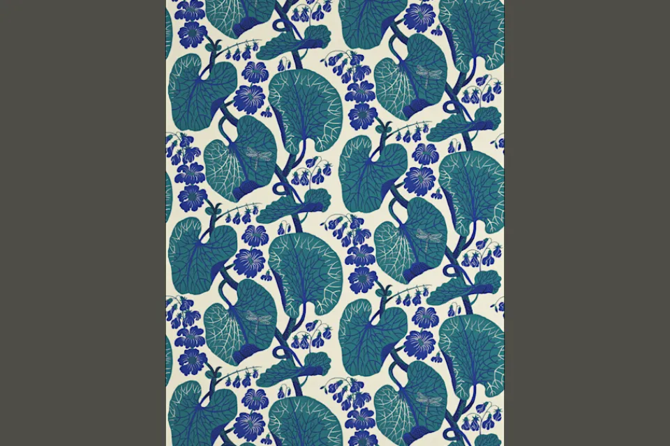 Bland mönstret Aramals stora gröna blad döljer sig trollsländor här och var. Mönstret formgavs av Josef Frank i början på 1940-talet och har fått sitt namn efter en naturskön strand i Spanien.
