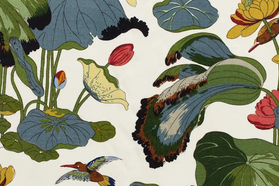Svenskt Tenns grundare Estrid Ericson reste mycket till olika platser runt om i världen. Hon letade alltid efter vackra föremål och textilier att ta hem och sälja i butiken på Strandvägen. Textil Lotus kommer från det engelska textilföretaget GP & J Baker, som i sin formgivning ofta hämtade inspiration från historiska mönstertraditioner. Estrid Ericson började köpa in textil från dem redan under 1930-talet. En stor del av William Turners formgivning för GP & J Baker 1915 bar kinesiska influenser, då han ägnade mycket tid till att studera kinesiska samlingar på Brittiska Museet. Mönstret Lotus är sprunget ur en målad sidenrulle från Ming-dynastin, som förvärvas av museet ett par år tidigare. Det är en genrebild av Pilingskolan som skildrar ett par kungsfiskare flygandes över en ägretthäger, som i sin tur söker skydd under droppande lotusblad.