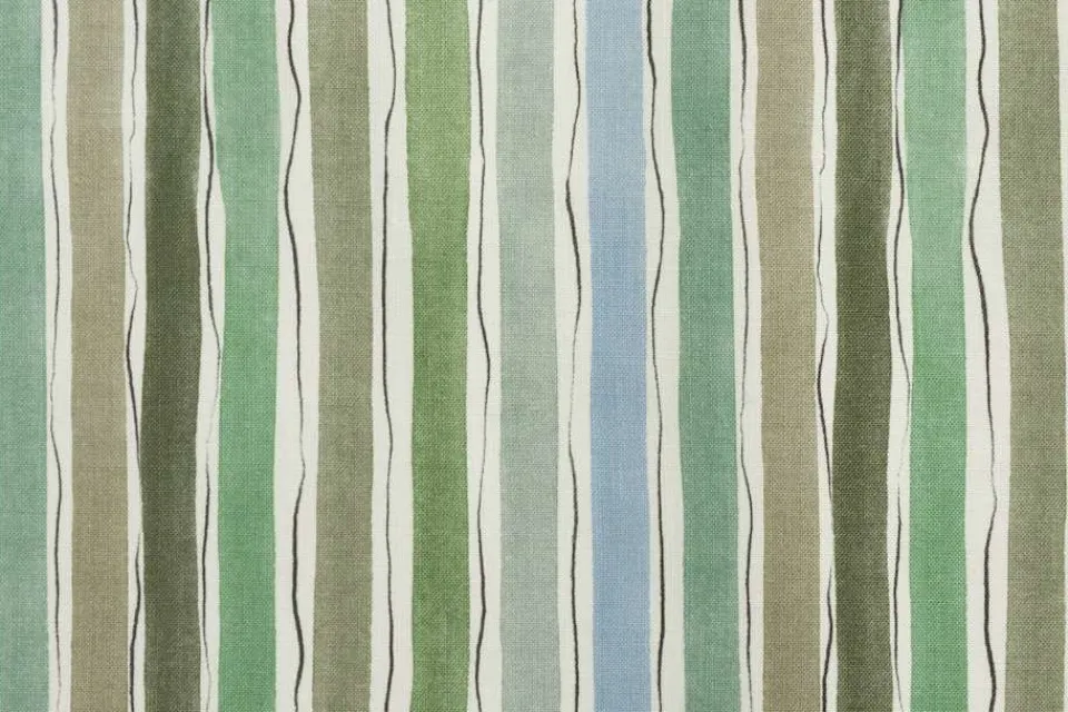 Textil Wisteria smyckas av målade ränder i blågröna toner, inspirerade av blommande blåregn i trädgården som omger Villa San Michele på Capri. Mönstret är formgivet av designern Lars Nilsson för Svenskt Tenn, och finns även i en annan färgställning vid namn Anacapri.
