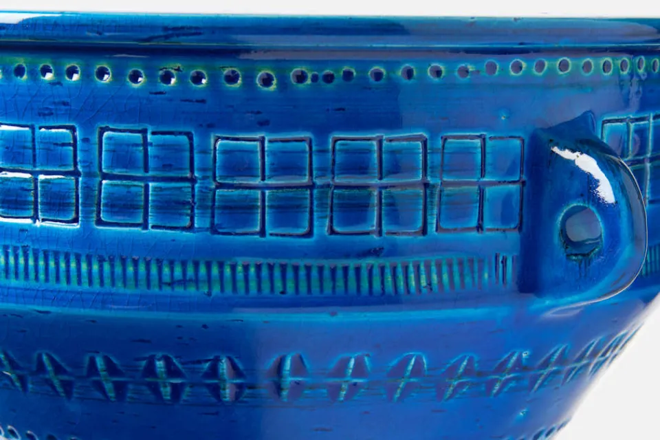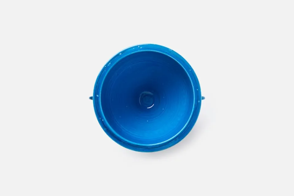 Dekorativ vas med handtag i keramik, formgiven av Aldo Londi för Italienska Bitossi, ett familjeägt företag som skapar unika och dekorativa föremål till hemmet och det dukade bordet. Vasen tillverkas hantverksmässigt i fabriken i Fiorentino, Toscana, och ger uttryck för en traditionell, italiensk design i samtida tappning. Den djupblå färgen för tankarna till medelhavet och bidrar med ett slående vackert uttryck i din inredning.