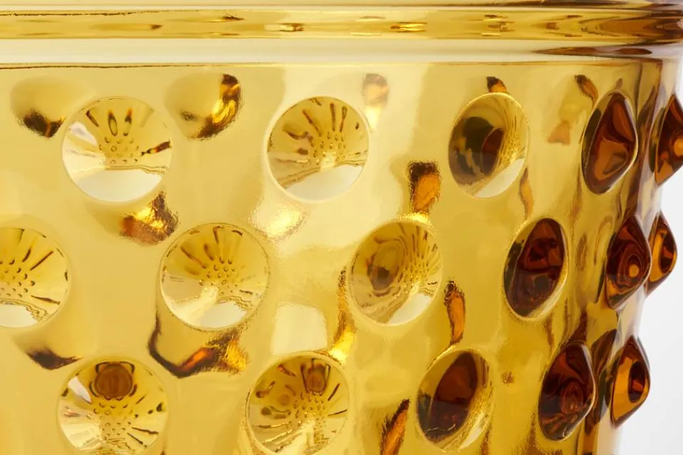 Krukan har en tunn skarv i glaset som uppkommer då den är pressad i en delbar gjutform. Den poleras i efterbearbetningen, men spår av den hantverksmässiga produktionen finns alltid kvar på slutprodukten.