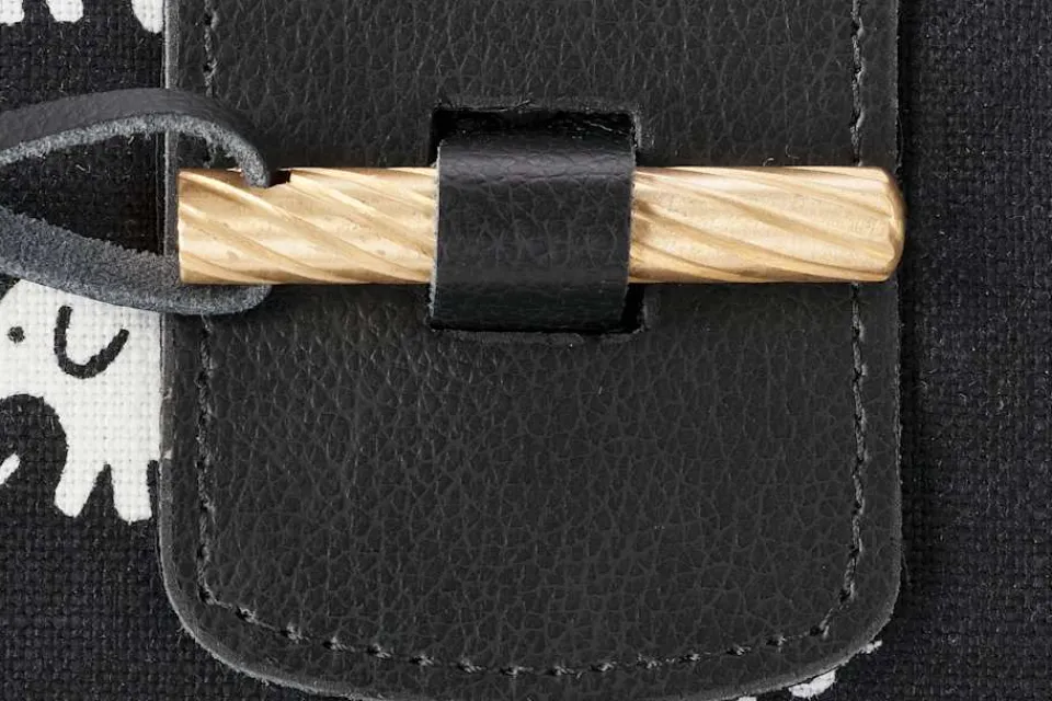 Förstärkt och lätt impregnerat lin. Detaljer i skinn och mässing. Varje enskild produkt är unik och mönstrets placering varierar från bilden.