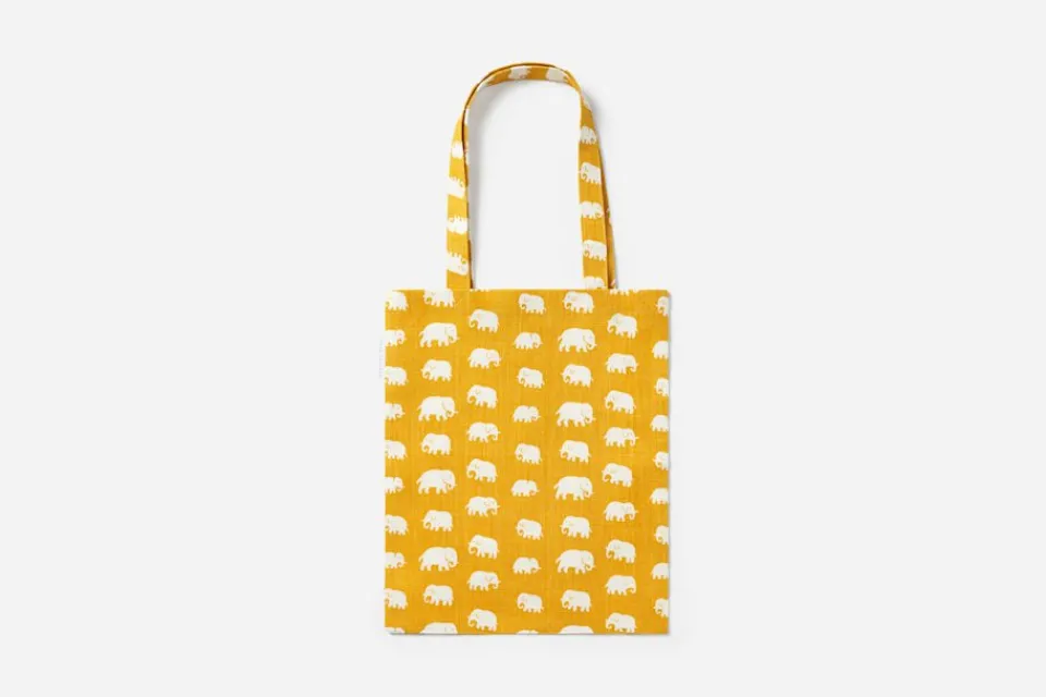 En mjuk tygkasse med Svenskt Tenns klassiska elefantmönster, formgivet av Estrid Ericson på 1930-talet.