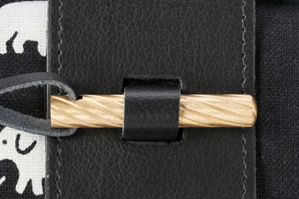 Förstärkt och lätt impregnerat lin. Detaljer i skinn och mässing. Varje enskild produkt är unik och mönstrets placering varierar från bilden.
