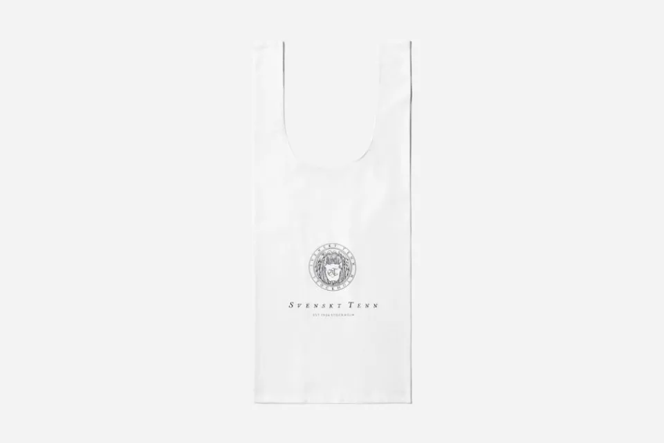 I tillverkningen av denna hållbara tygkasse samarbetar Svenskt Tenn med Reused Remade, som skapar klimatsmarta textilprodukter av återvunna hotellakan. Genom att utmana rådande produktion av såväl tyg- som plastkassar, bidrar verksamheten till framtidens cirkulära ekonomi. Svenskt Tenns klassiska firmamärke formgavs 1924 av dåtidens främste grafiska formgivare, Akke Kumlien. Bertil Lybeck ritade de två änglarna i sigillet, som idag kommit att benämnas som Änglamärket.